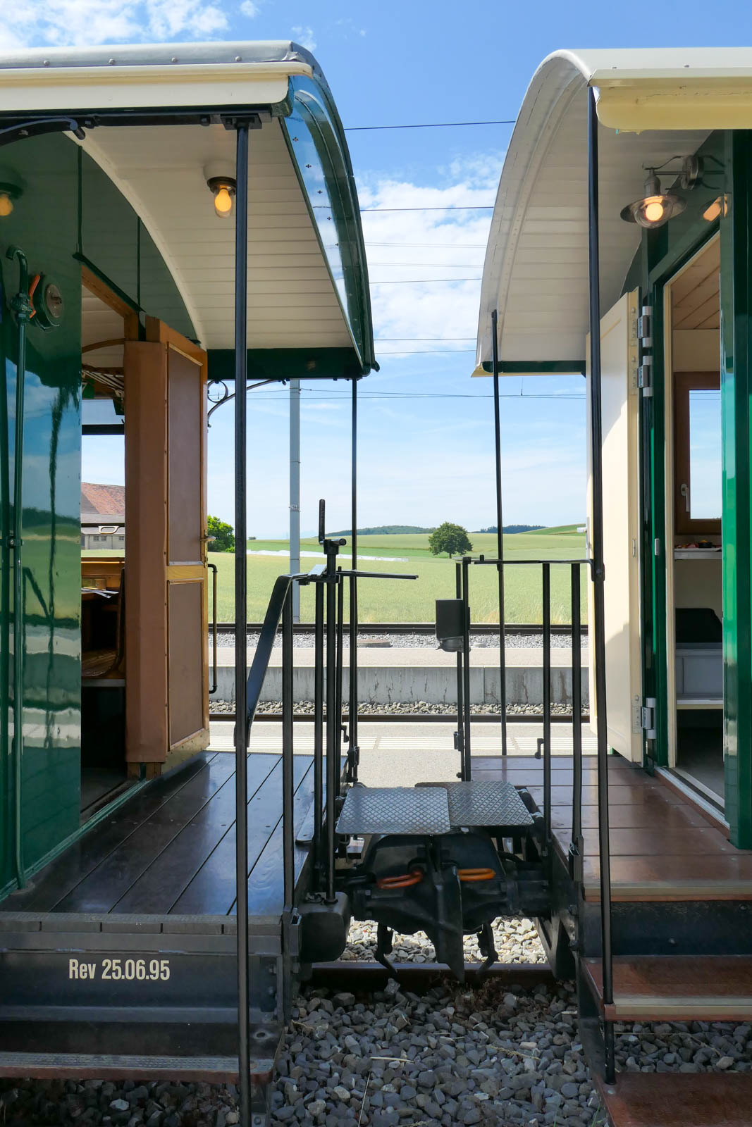 Pour le brunch des champs, le BAM part de Morges et nous emmène jusqu’à l’Isle, nous offrant de très belles vues sur les vignes et les champs. Il s’agit d’un aller mais il est bien sûr possible de revenir en train ! Le BAM marque quelques pauses et effectue des manœuvres. Nous avons pu descendre nous dégourdir les jambes à deux reprises.