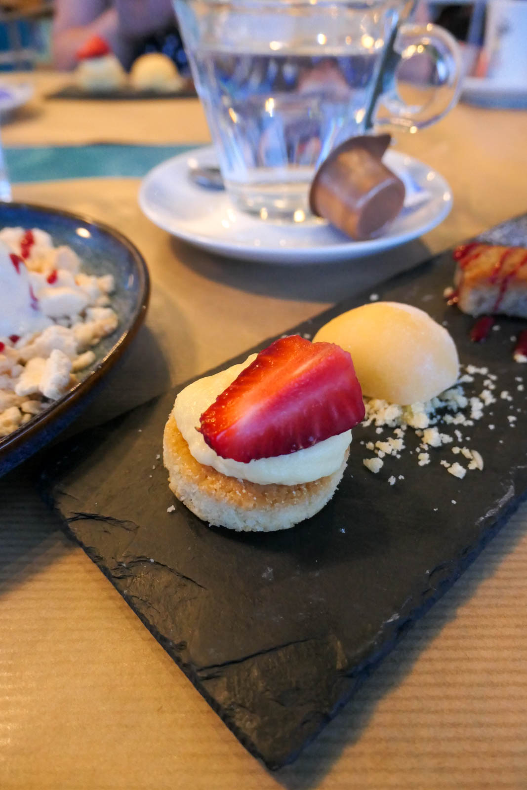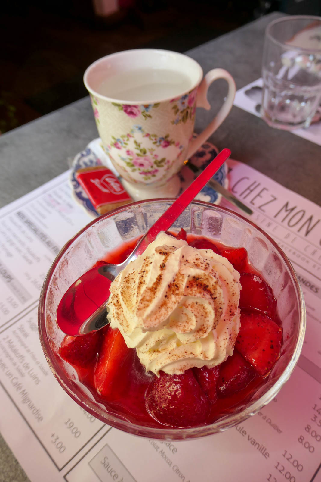 Pour terminer au mieux le repas, j’ai dégusté une coupe de fraises et un thé servi dans une adorable tasse.