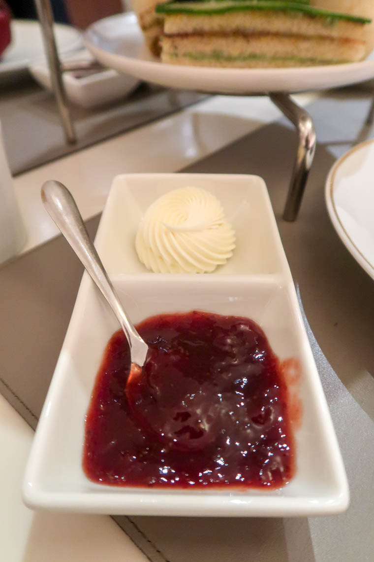 – les scones traditionnels étaient bons et eux aussi très denses. La confiture en accompagnement était la bienvenue. Nous n’avons guère touché à la crème, dont la texture était trop proche de celle du beurre pour nos goûts.