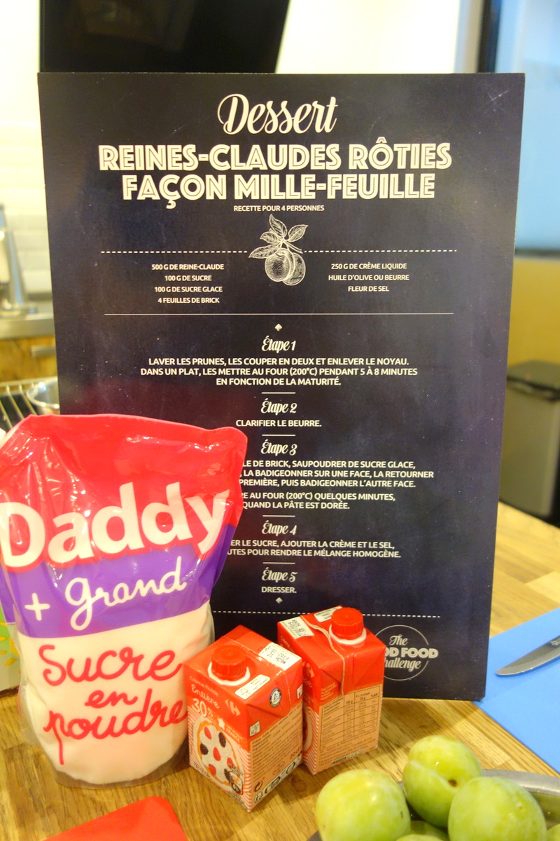 3e ex-æquo également : le filet de poulet et ses carottes en quatre façons. Comme vous le savez, je ne mange pas de volaille. Mais la purée de carotte était bonne ! Les deux mets les mieux notés ont été les reines-claudes rôties façon mille-feuille – le dessert de l’équipe gagnante – et le pain perdu à la figue. De quoi s’inspirer !