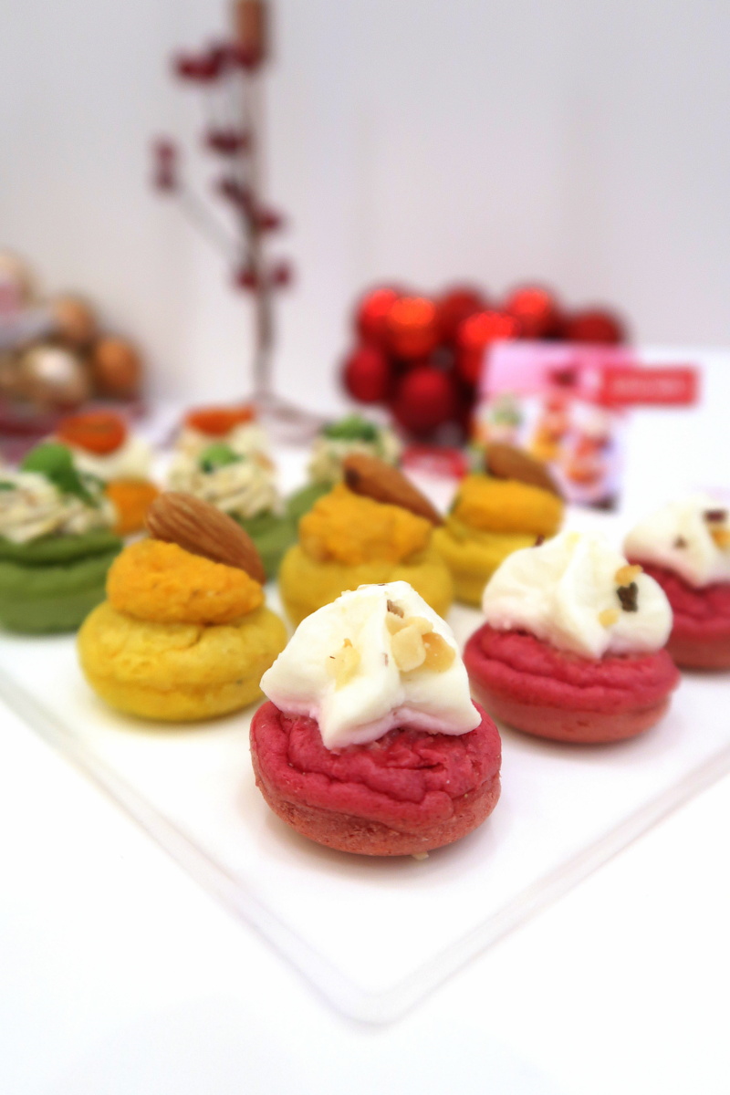 • six mini-bonnets de père Noël framboise-vanille sablé coco (7,50€), à base de mousse mascarpone vanille, purée de framboises et sablé à la noix de coco