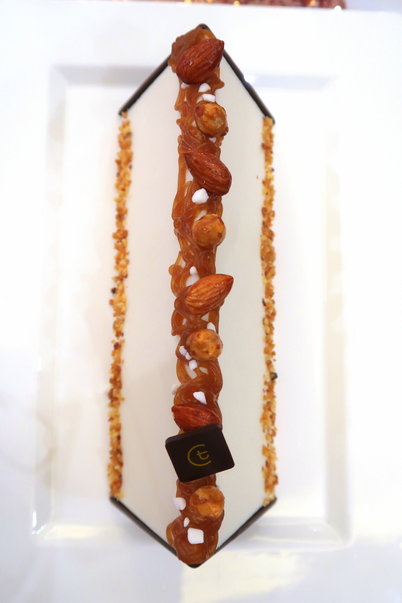 • entremets pâtissier vanille-caramel-praliné (8 parts, 11,95€), une bûche pâtissière qui conjugue une sauce au caramel tendre vanillé, un crémeux noisette, un croustillant praliné et une mousse à l’extrait de vanille Bourbon de Madagascar à la crème fraîche, le tout déposé sur un biscuit noisette pur beurre