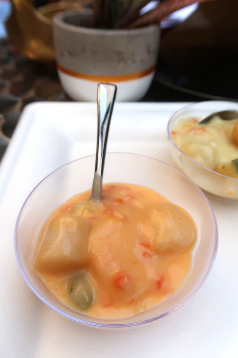 - deux cassolettes aux Noix de Saint-Jacques d’origine France et crevettes, sauce au Cognac Fine Champagne agrémentée de carottes et fèves (220 g, 11,30€). J’ai trouvé que ces recettes étaient originales, gourmandes et ne manquaient pas de peps !