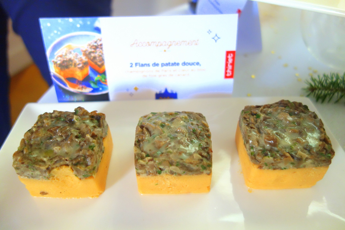 - deux flans de patate douce, champignons de Paris, cœur au bloc de foie gras de canard (150g, 4,20€)