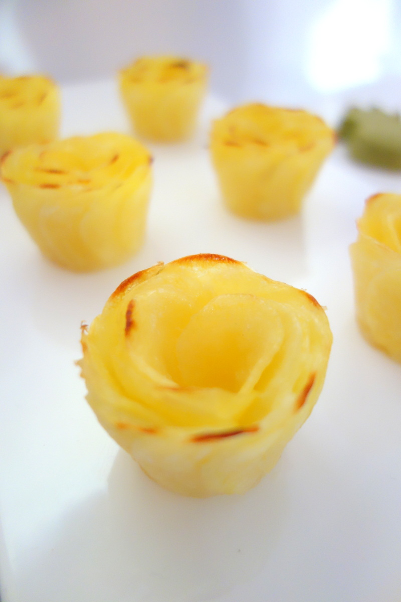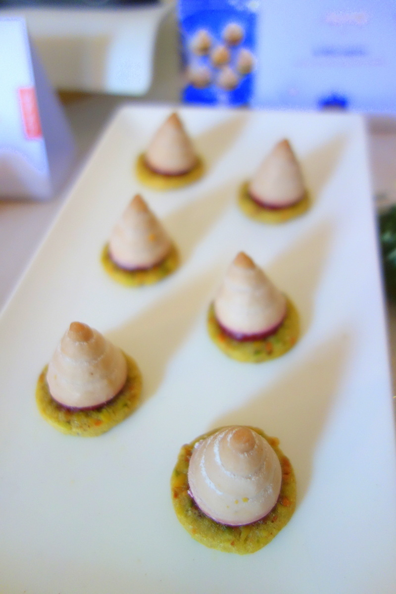 - six mini-sapins au bloc de foie gras de canard (60g, 8,50€) et leur compotée de framboises acidulées sur un biscuit croquant saveur pistache. Ces bouchées au foie gras sont délicieuses ! ♥