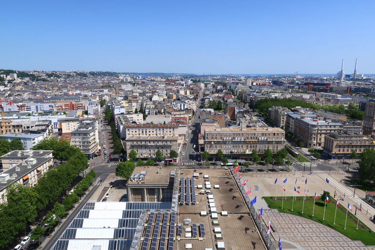 Pour nous donner une première idée du Havre (et apercevoir, de très loin, Deauville et Trouville), nous sommes montés au 17e étage de la mairie, à 75 mètres au-dessus du sol. Il est possible d’y monter en prenant contact avec la maison du patrimoine.