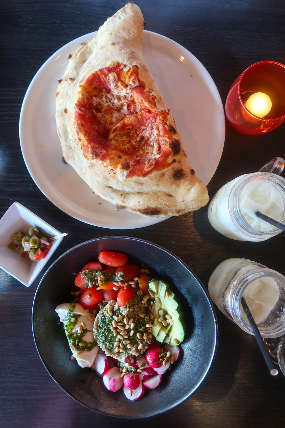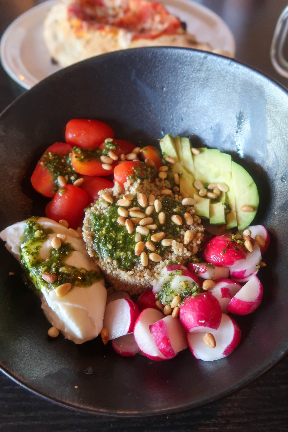 Monsieur a commandé une pizza calzone (15€) et une pina colada à base de rhum Havana trois ans d’âge (4cl), de crème de coco, de sucre de canne et de jus d’ananas (9€). Pour ma part, j’ai choisi le poké italian (15€), qui associe quinoa, avocat, radis, tomates cerises, mozzarella di bufala, pignons de pins et sauce pesto, ainsi qu’un virgin colada à base de sirop de sucre de canne, jus d’ananas, crème de coco (7€).