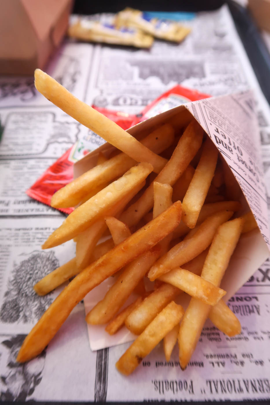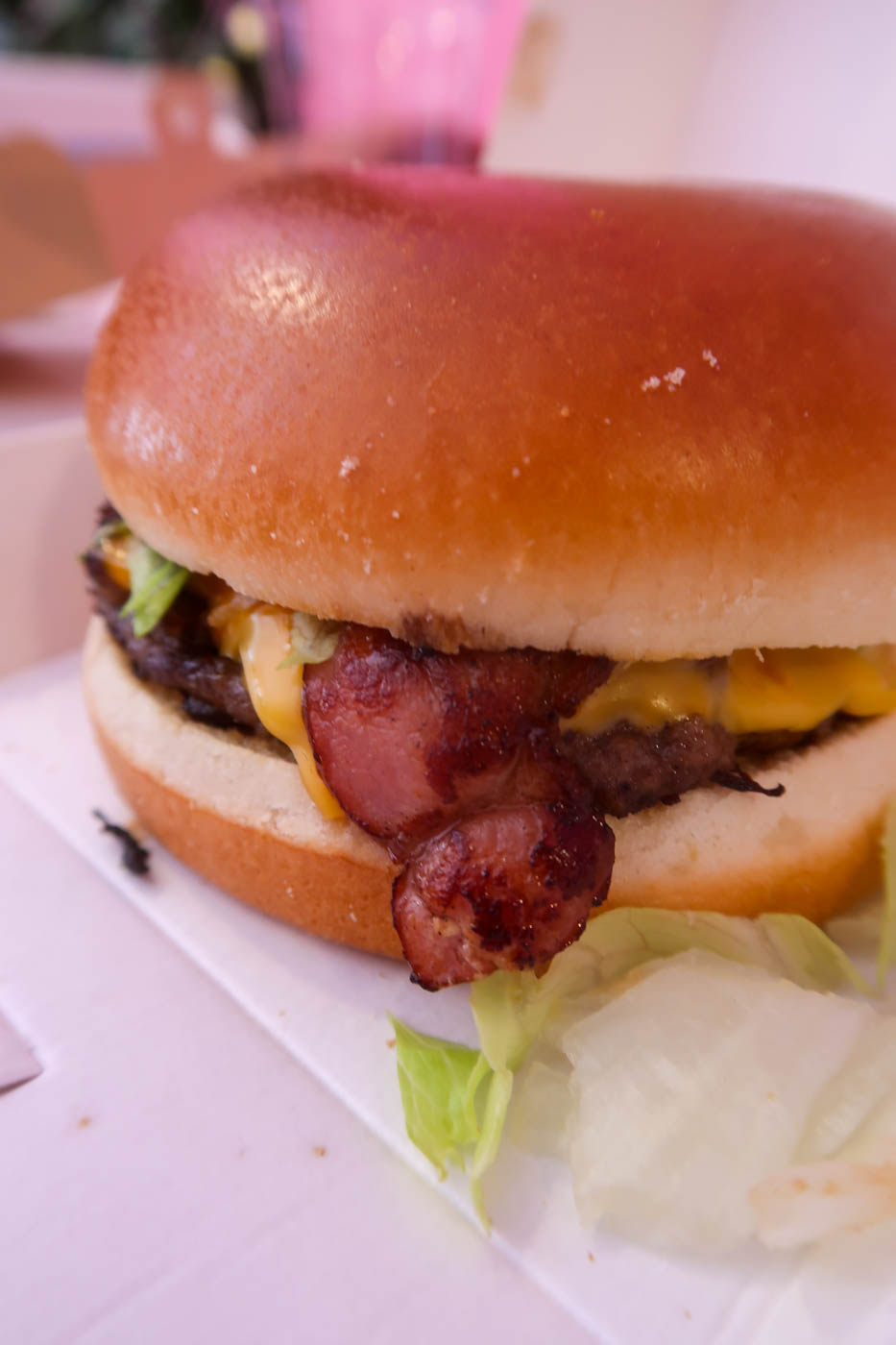 L’attente a été un peu longue mais nous avions besoin de repos. Nous avons tous deux dégusté un burger Soo cheezy bacon (7,55€) – composé de pain, steak de 125 grammes, bacon grillé, cheddar, etc. – avec des frites nature (2,45€) et au cheddar (3,45€) et chacun un Ginger Ale, un soda artisanal de Brooklyn (3,85€, 35 cl). Sympa !
