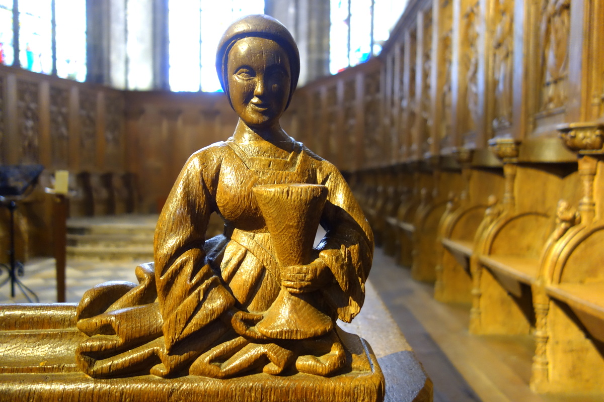 • comme la définit le Larousse, la miséricorde est une « sorte de console placée sous le siège relevable d’une stalle d’église et servant, quand ce siège est relevé, à s’appuyer tout en ayant l’air d’être debout ». Les menuisiers ont sculpté des sujets profanes sur les miséricordes car il n’était pas question que l’on pose ses fesses sur des Saints. L’on compte 74 places dans les stalles de l’église Saint-Nicolas-de-Tolentin.