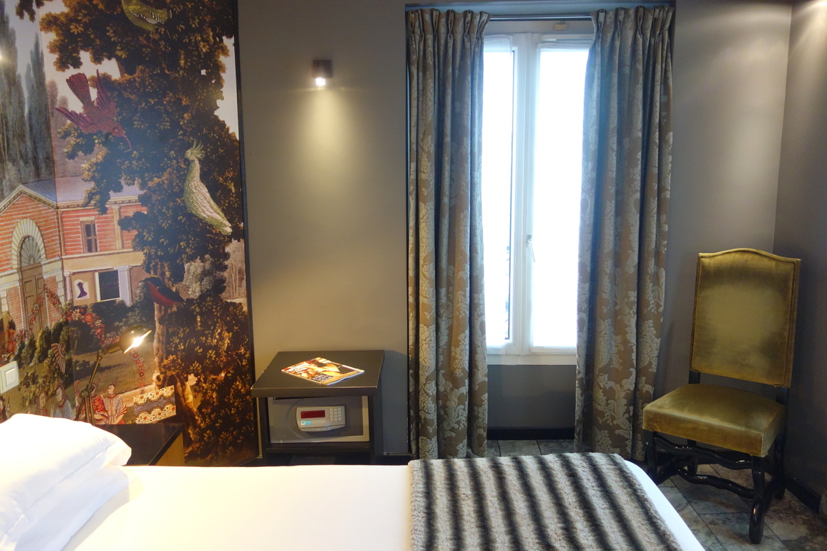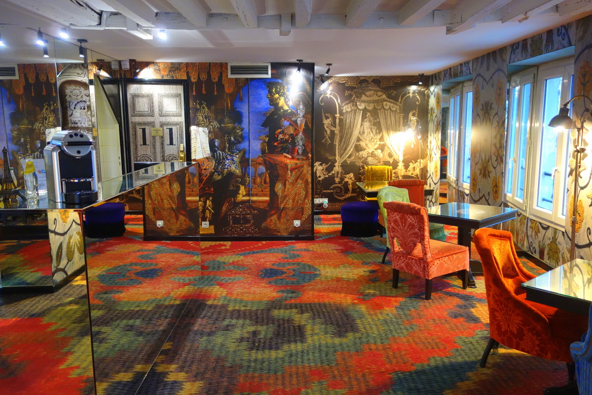Monsieur et moi avons séjourné le temps d’une nuit à l’hôtel Notre-Dame, un très joli et douillet trois étoiles parisien. Comme son nom le laisse imaginer, il donne sur la cathédrale et l’île de la cité. À sa porte : Saint-Michel, Saint-Germain et le Quartier latin… autant dire le cœur de Paris, qui nous fait assurément rêver ! L’hôtel, très charmant, est installé dans une typique bâtisse parisienne. La décoration colorée et mixant motifs et miroirs est signée Christian Lacroix.