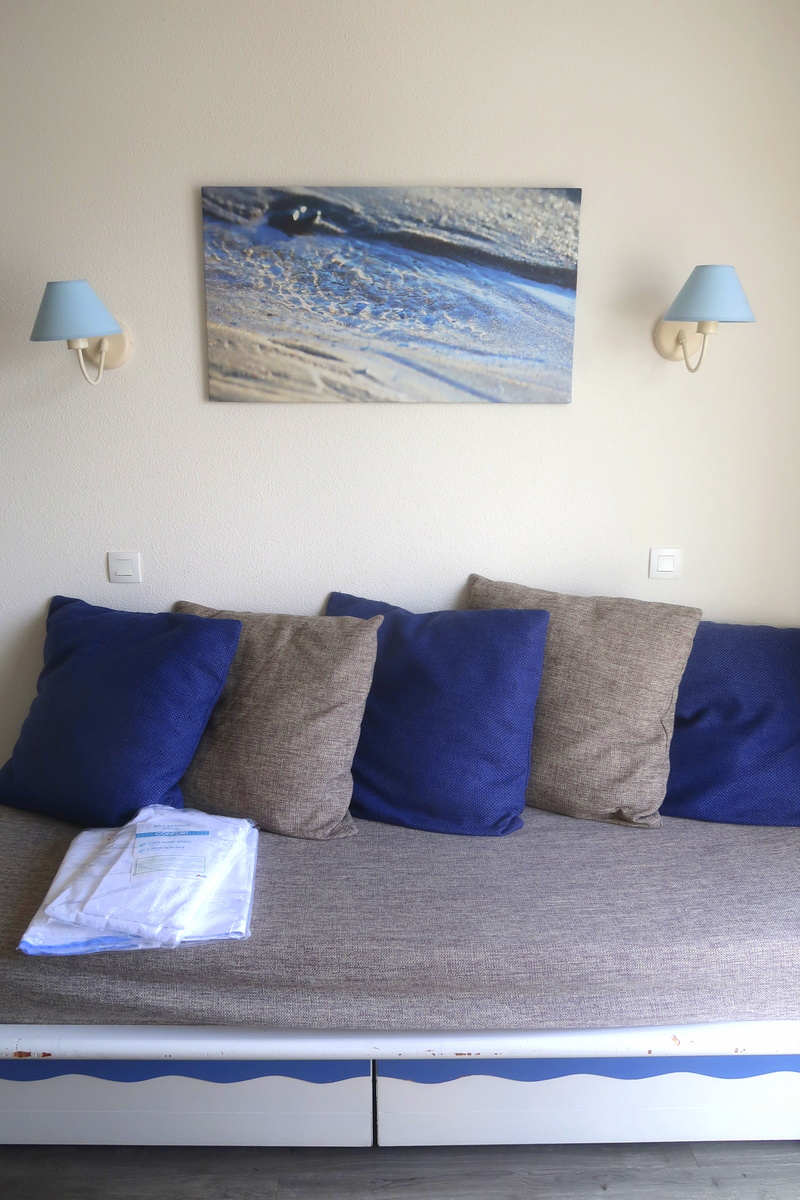 Le salon est décoré dans des tons clairs avec deux canapés-lits gris et bleus. Cela nous a permis de nous installer le soir pendant le couvre-feu pour lire tranquillement dès 18h. La table du salon est entourée de six chaises et un tabouret placés un peu à l’étroit. La quantité de vaisselle est suffisante pour trois ou quatre personnes. Un lave-vaisselle est mis à disposition et fonctionne très bien. Nous l’avons d’autant plus apprécié que nous n’en avons pas chez nous.