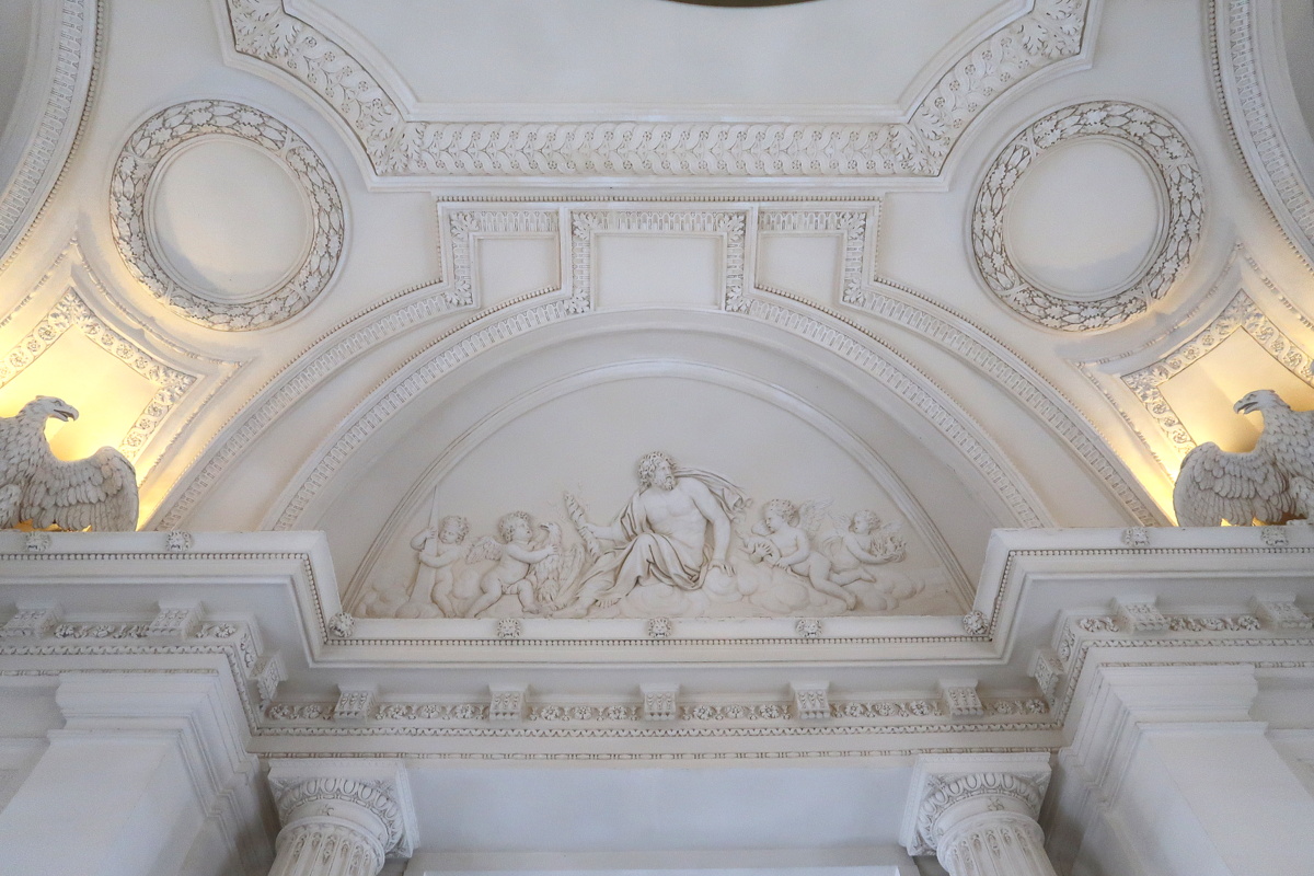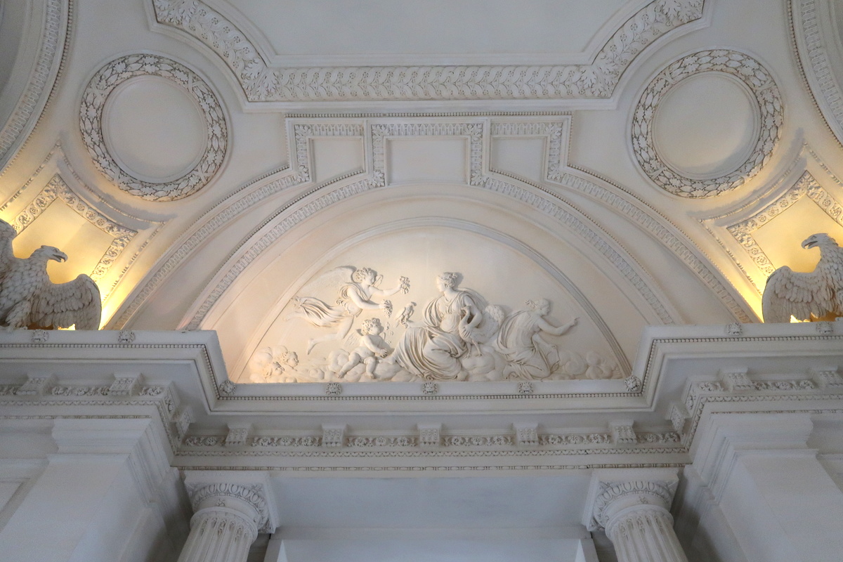 La visite est l’occasion d’apprendre que le fait d’entrer dans une demeure par le vestibule et non les escaliers était novateur à l’époque de sa construction. Celui de Maisons est particulièrement vaste et monumental. En levant les yeux, on découvre des bas-reliefs représentant la Terre, l’Eau, l’Air et le Feu.
