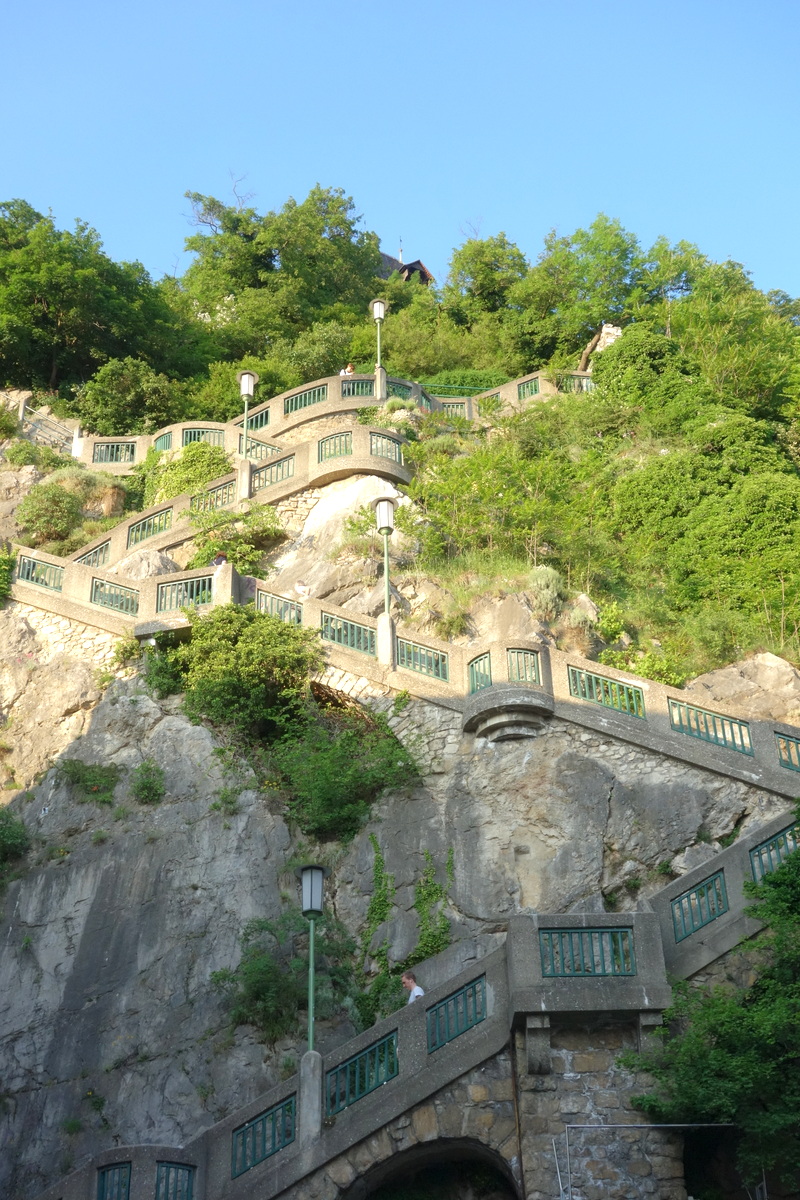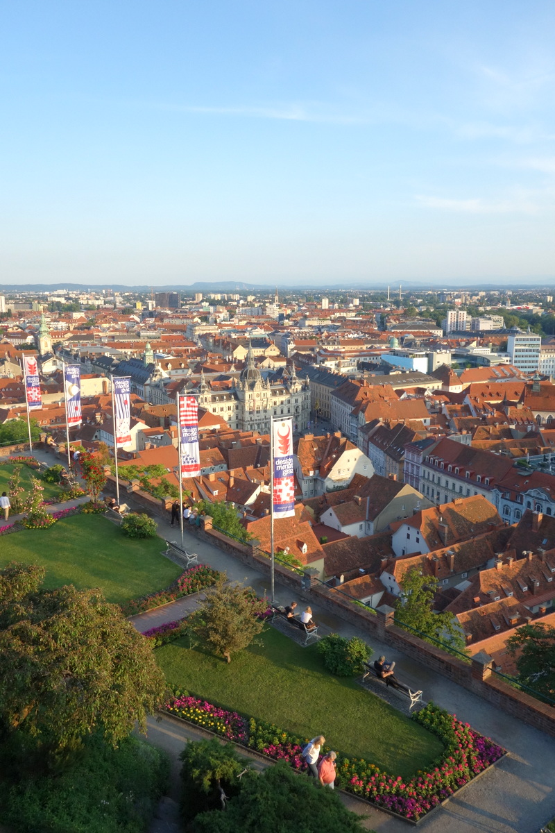L’on monte en haut de la colline du Schlossberg à pieds, en ascenseur ou en funiculaire. Nous avons gravi les 260 marches. Une vraie petite séance de sport, surtout avec la chaleur ! On s’étonne de trouver un parc sur les toits de Graz. Le point de vue sur la ville, et notamment sur la Kunsthaus, est vraiment sympa.
