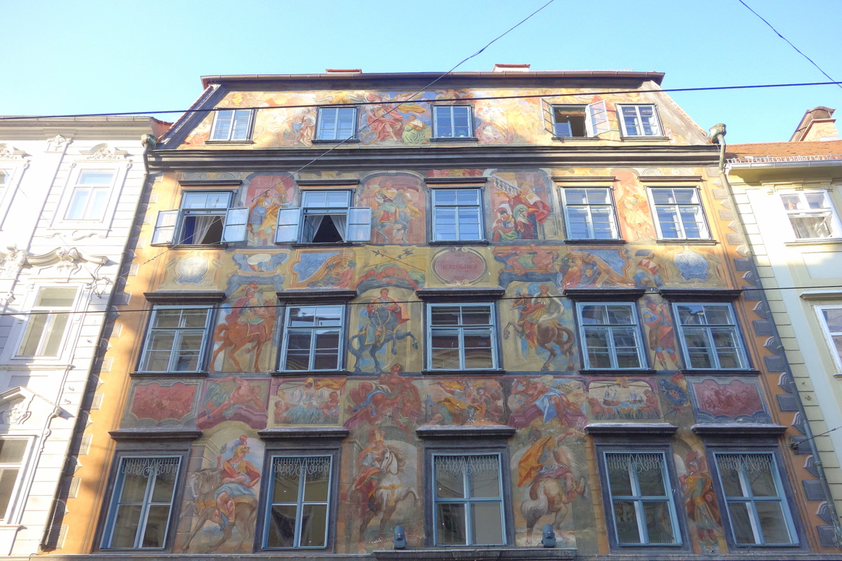 Difficile de ne pas s’arrêter quelques instants devant la Gemaltes Haus, une maison à la façade peinte par un artiste italien (juste ci-dessus à droite !). Peut-être reconnaîtrez-vous Apollon, Jupiter, Pluton, Minerve, Mars ou Mercure ? C’est dans cette demeure que séjournaient les souverains habsbourgeois lorsqu’ils venaient à Graz.