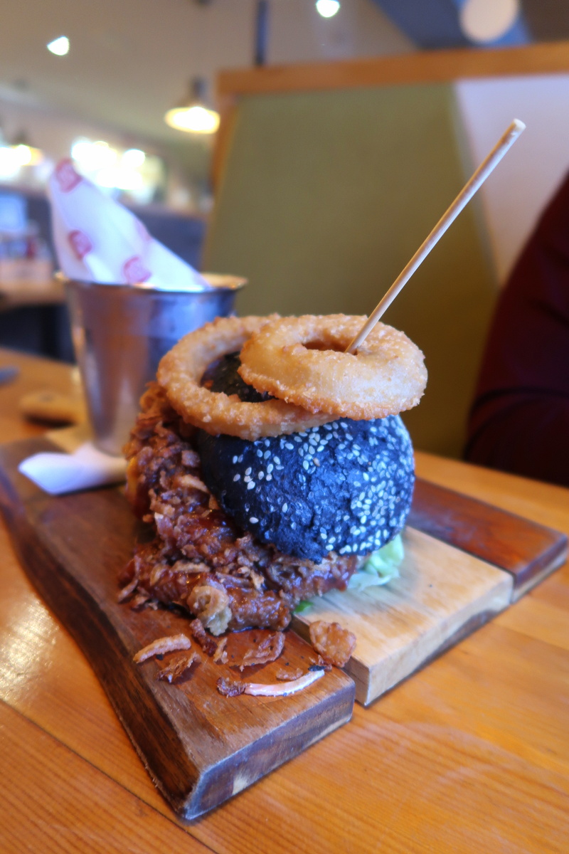 J’y ai mangé un burger Shelby GT 500 (11,95 €) avec un cola (1,90 €). Mon plat était à base de « the mightest mustang on the Stabei 60z beef » (j’en ai juste compris l’idée essentielle : c’était du bœuf mais avec un goût différent de celui auquel on a l’habitude), de bacon croustillant, d’oignons sautés et de cheddar fondu. Mon choix s’est fait en fonction de la viande car je mange du bœuf et du porc mais difficilement les autres viandes et ne suis pas amatrice de fortes épices ou d’oignons en excès.