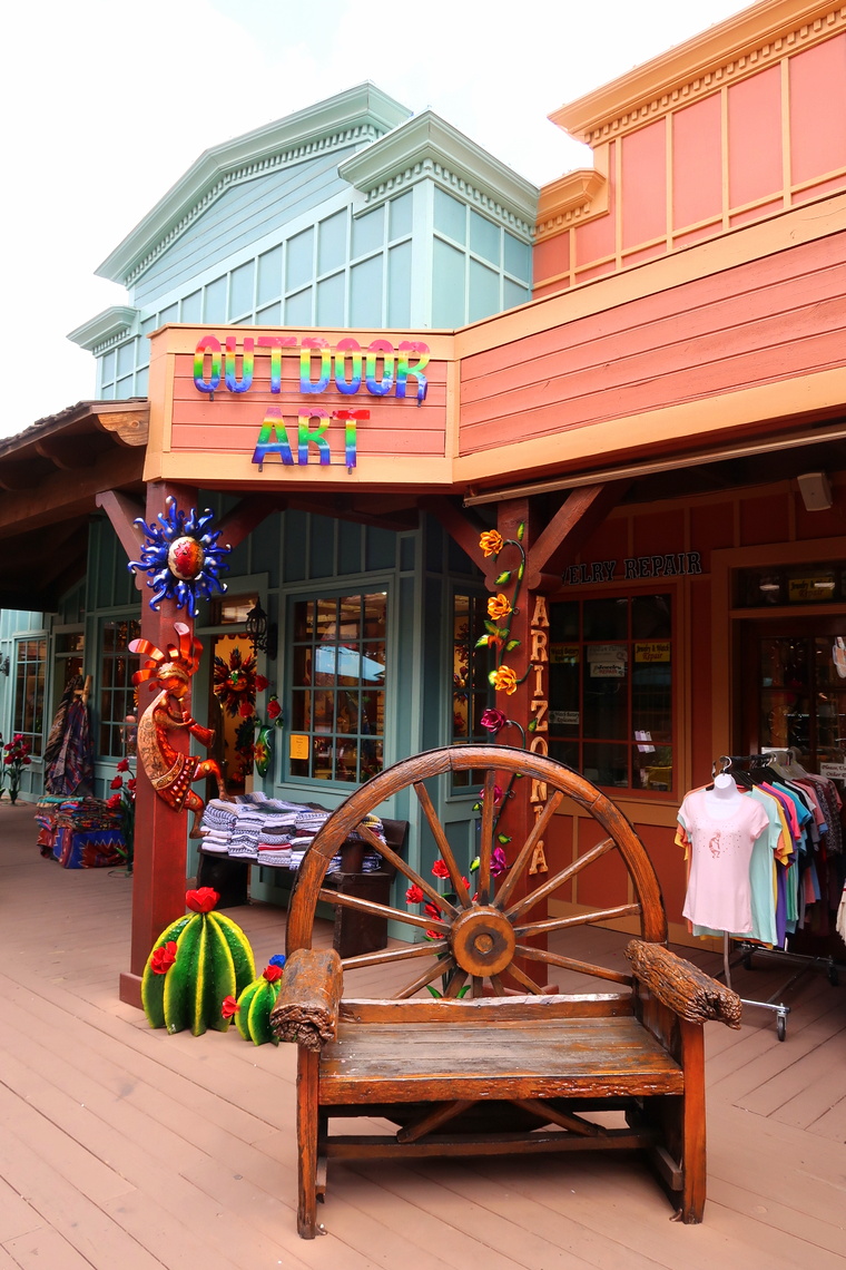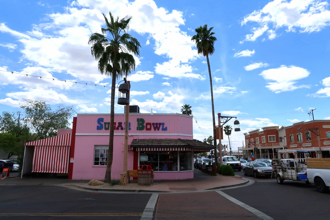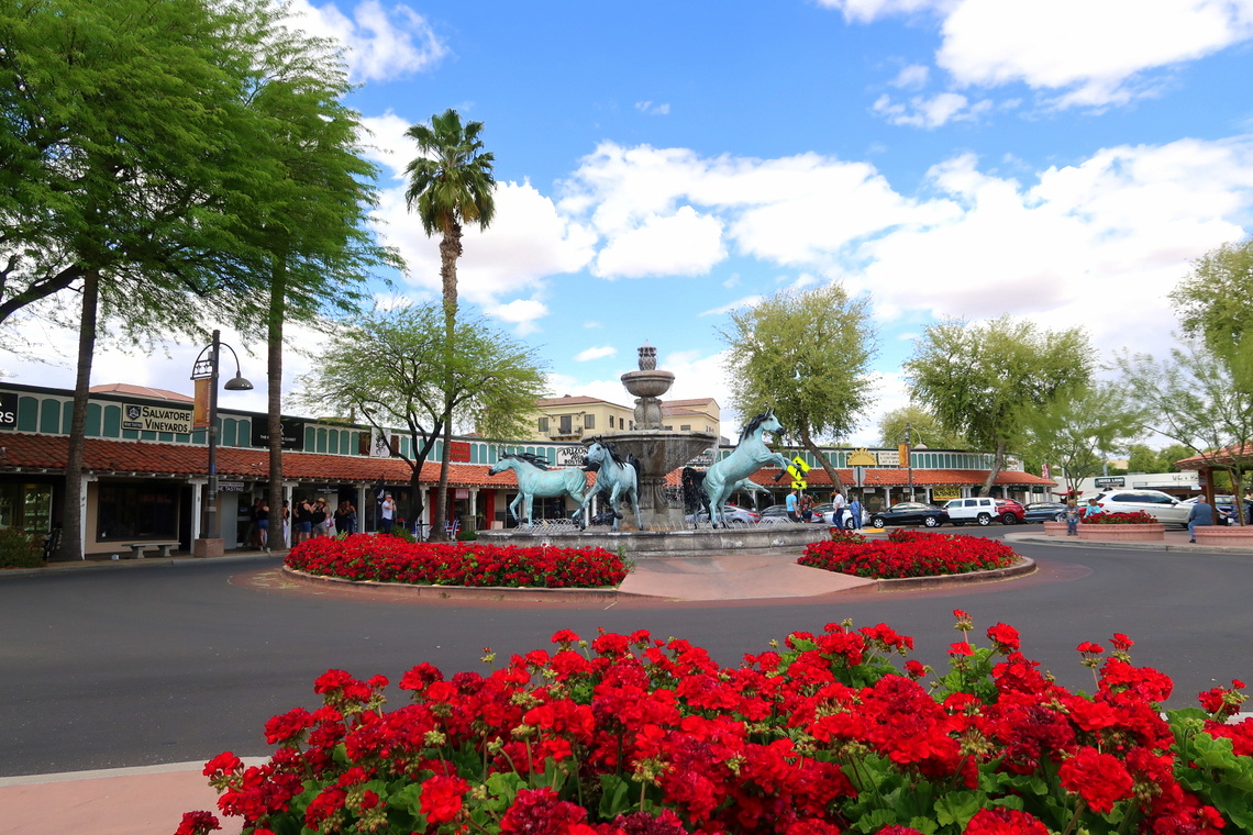 Après avoir passé une agréable matinée au jardin botanique du désert, nous avons pris le chemin de Scottsdale, à l’Est de Phoenix. Cette vieille ville a un côté Frontierland – avis aux cow boys ! – et est vraiment touristique. Au programme : galeries, restaus, boutiques… Sympa et dépaysant !