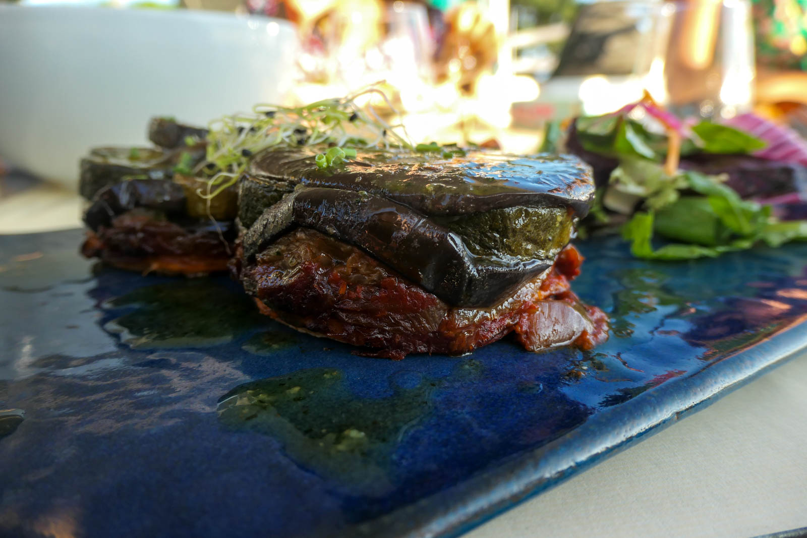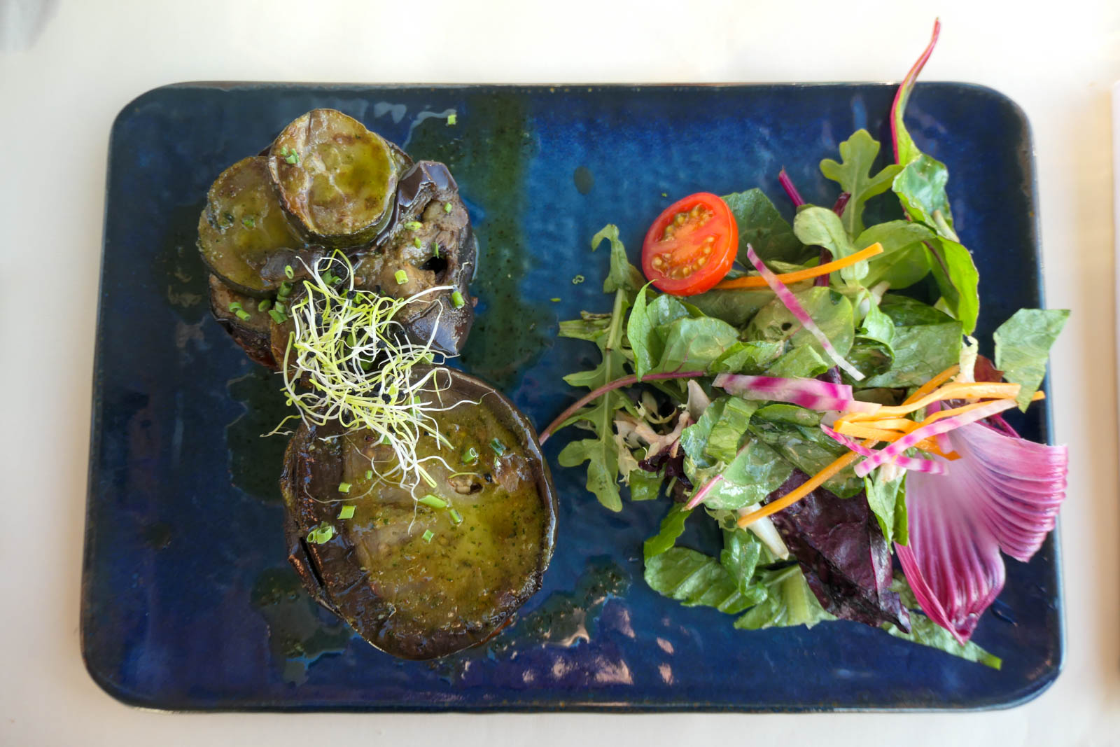 Pour débuter, j’ai choisi les légumes rôtis, crumble au parmesan. L’entrée est essentiellement composée de poivrons (oups, mon estomac les supporte mal donc j’en ai fait don) et de salade, avec une agréable touche de pesto.