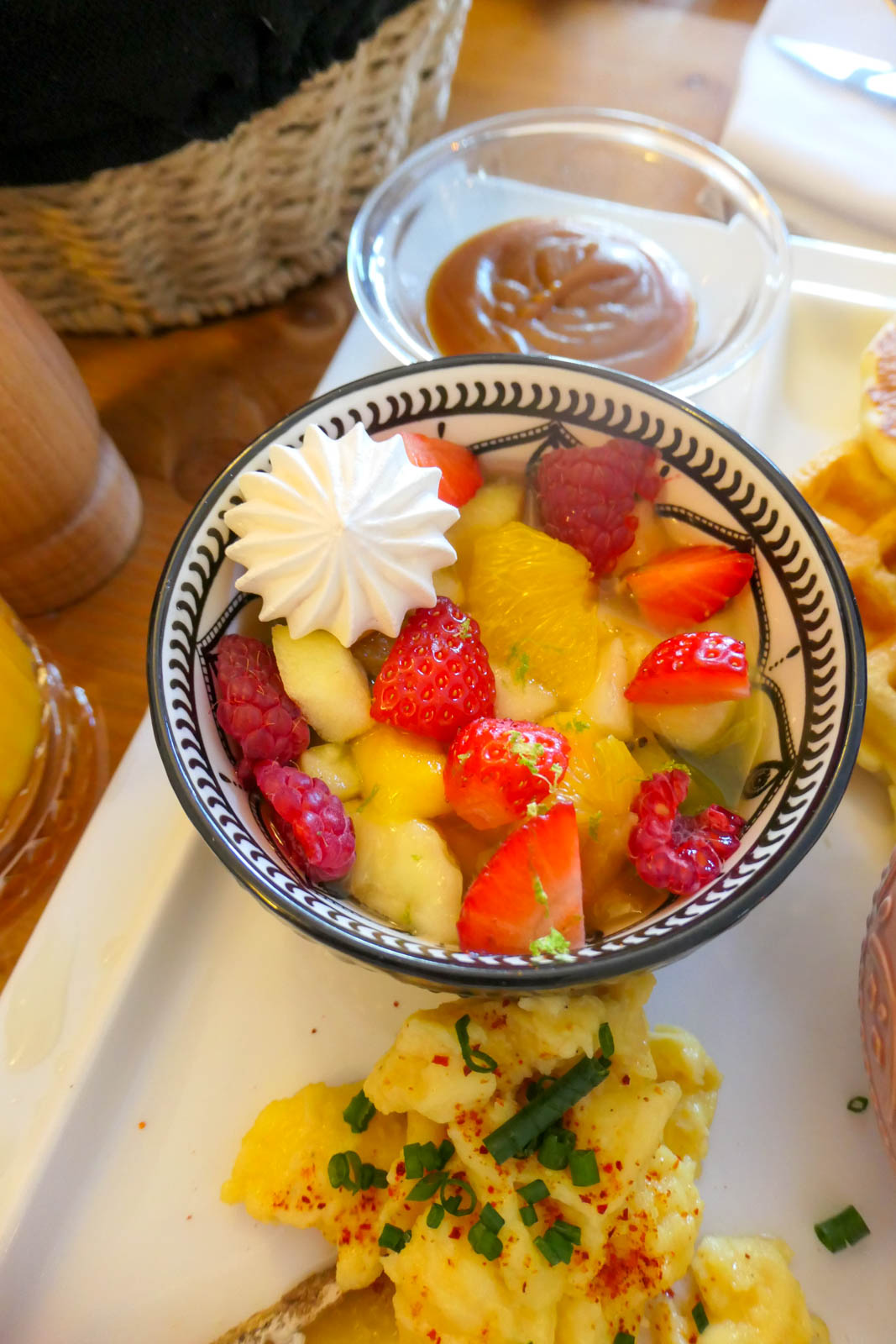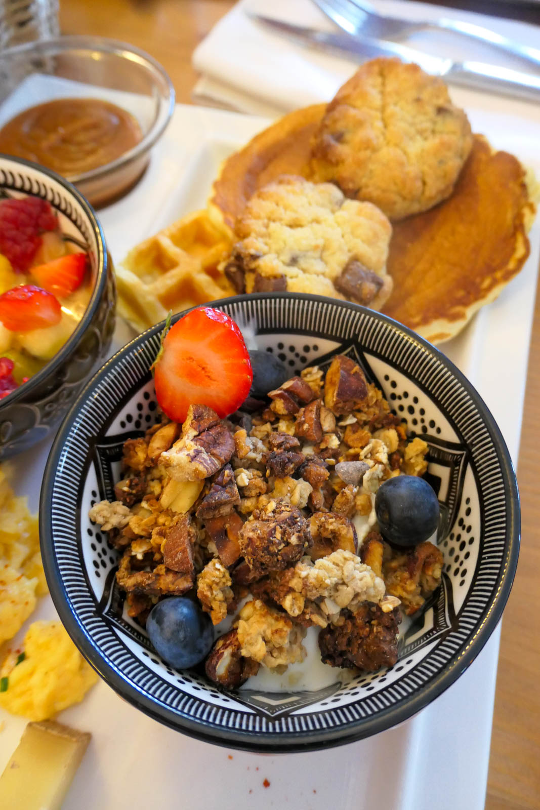- sucré : pancake, gaufre, cookie, salade de fruits (délicieuse !), fromage blanc de la ferme du Vern et son granola maison