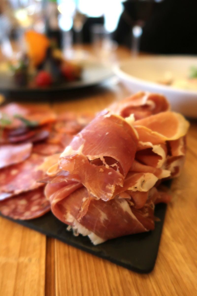 Les amateurs de vin vous parleront mieux que moi de la ligne rouge puisque je ne bois pas d’alcool. J’ai cela dit pu me faire une idée de son ambiance puisque nous avons passé la soirée de façon conviviale autour de deux grandes tables le temps d’un apéritif. Nous avons picoré quelques fourchetées des assiettes ou planches, au dressage impeccable, que l’on nous a servies :