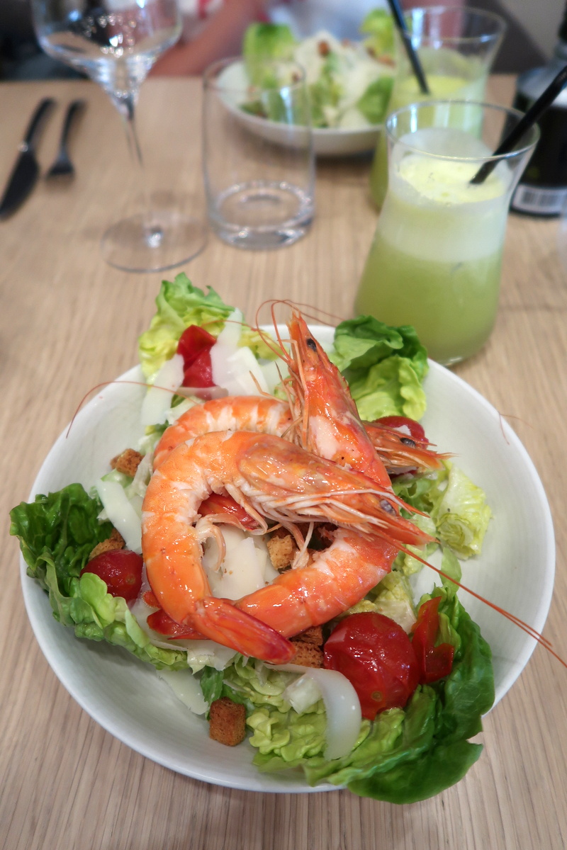En entrée, après un amuse-bouche, j’ai ainsi dégusté une salade Caesar accompagnée de gambas (et donc sans poulet) et d’un velours de parmesan (12€).